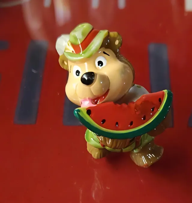 Orsetto Walter Melone, un simpatico personaggio in ceramica. Kinder sorpresa - Design colorato con cappello e fetta di anguria. - Dettagli curati e finitura lucida.