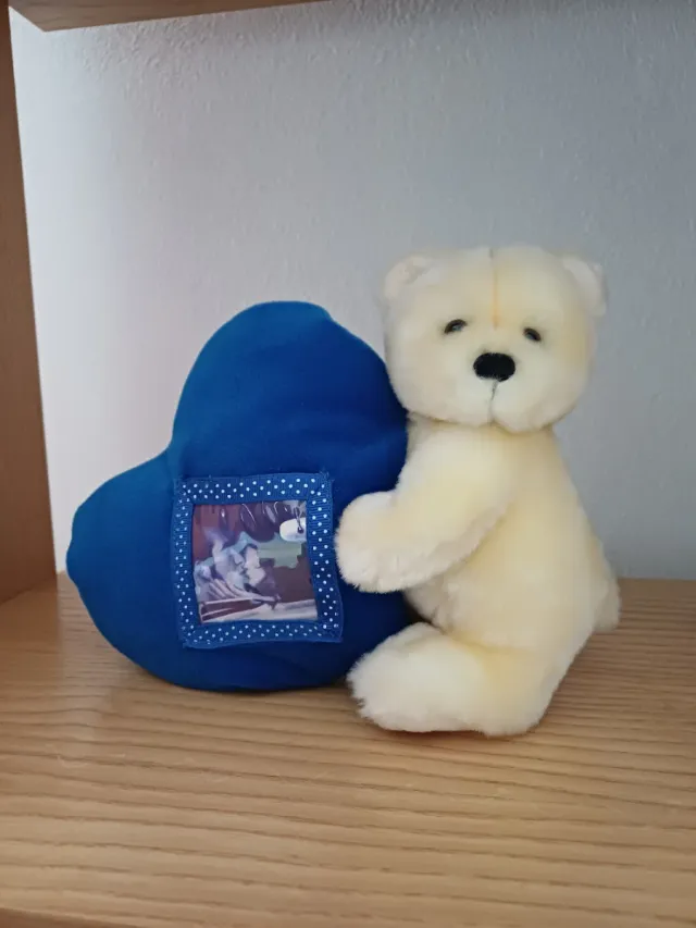 Orsetto portafoto Baci Perugina, un dolce ricordo. - Orsetto di peluche color crema. - Cuore blu con tasca portafoto. - Dettaglio con pois bianchi.