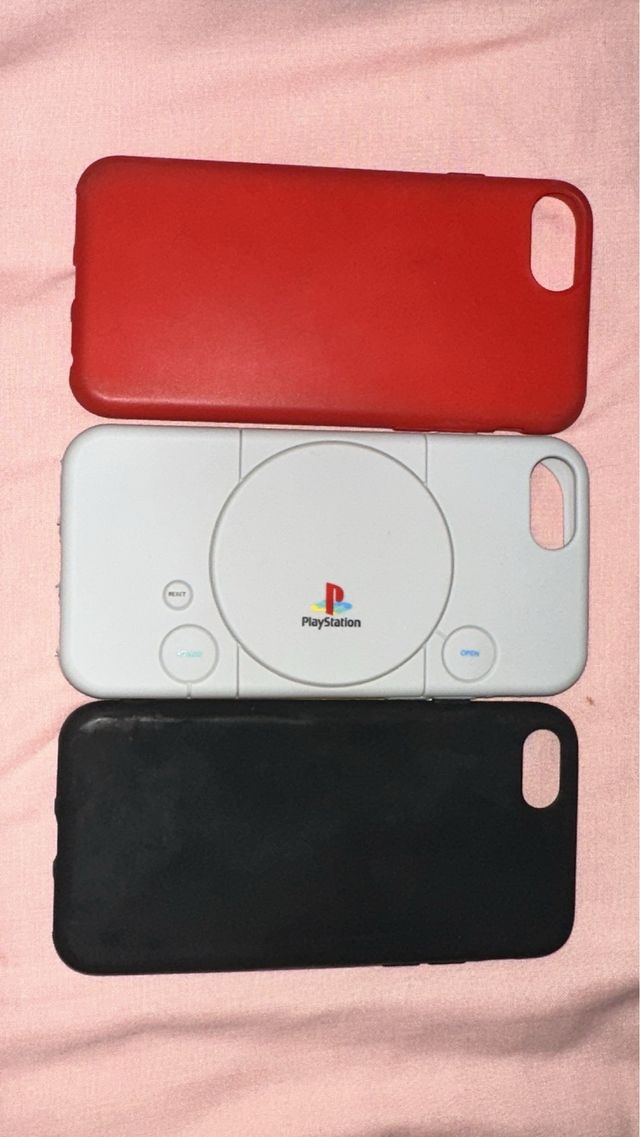 Dettagli del prodottoConfezione di tre custodie per iPhone 6, 7 o 8. Include una custodia rossa, una nera e una grigia con design PlayStation. La descrizione è stata tradotta automaticamente.