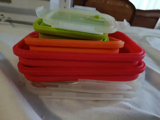 Dettagli del prodottoSet di cinque contenitori pieghevoli per alimenti. 2 grandi, 1 medio e 2 piccoli. Include contenitori nei colori rosso, arancione e verde. Coperchi trasparenti con chiusura ermetica. La descrizione è stata tradotta automaticamente.