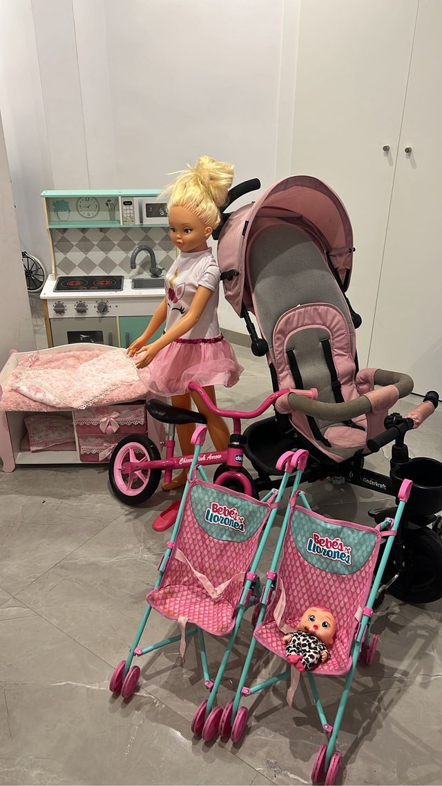 Dettagli del prodottoPacchetto di giocattoli per bambini che include una bambola grande, un triciclo e due passeggini. - Bambola con vestito rosa e capelli biondi. - Triciclo rosa con dettagli in nero. - Due passeggini gemellari rosa con tettoia e cestino. - Include una piccola bambola in uno dei passeggini. - Mobile da cucina giocattolo rosa e bianco. - Bici per bambini senza pedali. - Culla e fasciatoio per bambole. La descrizione è stata tradotta automaticamente.