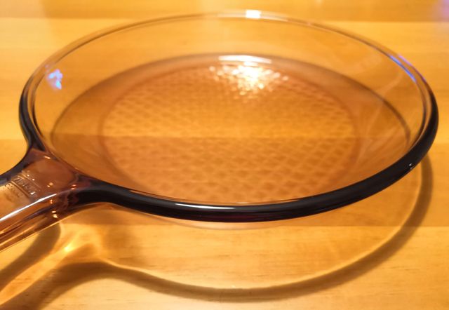 Dettagli del prodottoVendo padella Vision Corning France vintage, in vetro fumé/ambrato. Diametro esterno 27,5cm, diametro interno 26cm. La lunghezza dal manico al bordo 42cm.
