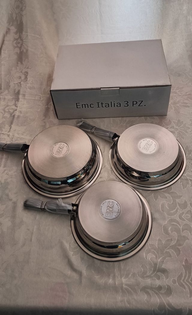 Dettagli del prodottoPADELLE EMC WARTERLESS ITALIA NUOVE tre pezzi inox 18 10 , CM 24 H 6, CM 26 H 6, CM 22 H 5 ,con scatola , Misure del prodotto