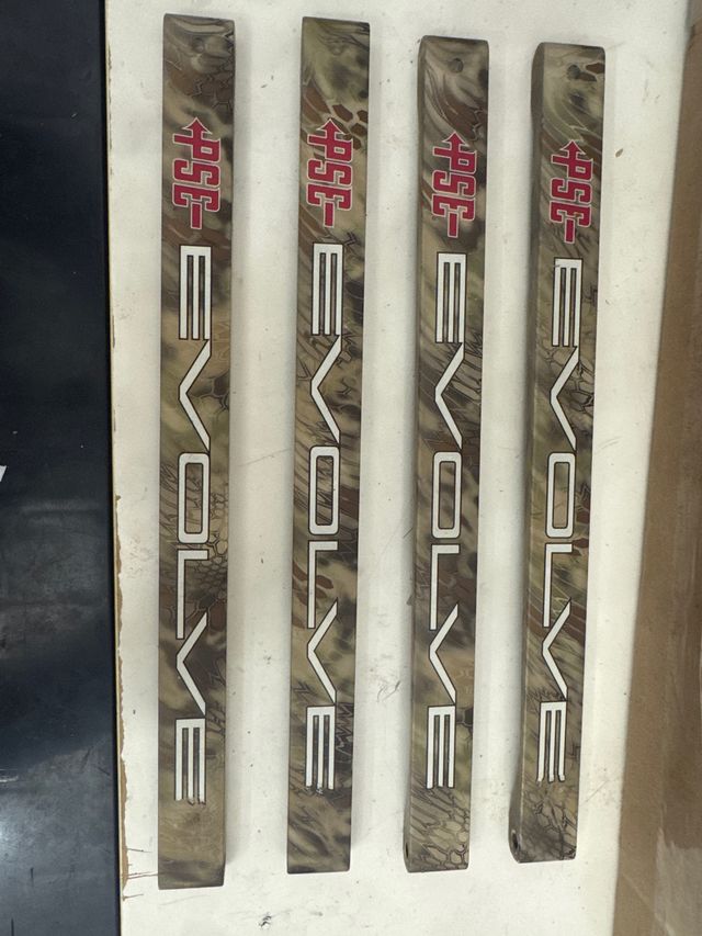 Set di quattro frecce per arco PSE EVO con design mimetico. Design mimetico. Logo rosso e bianco. Foro per appendere.