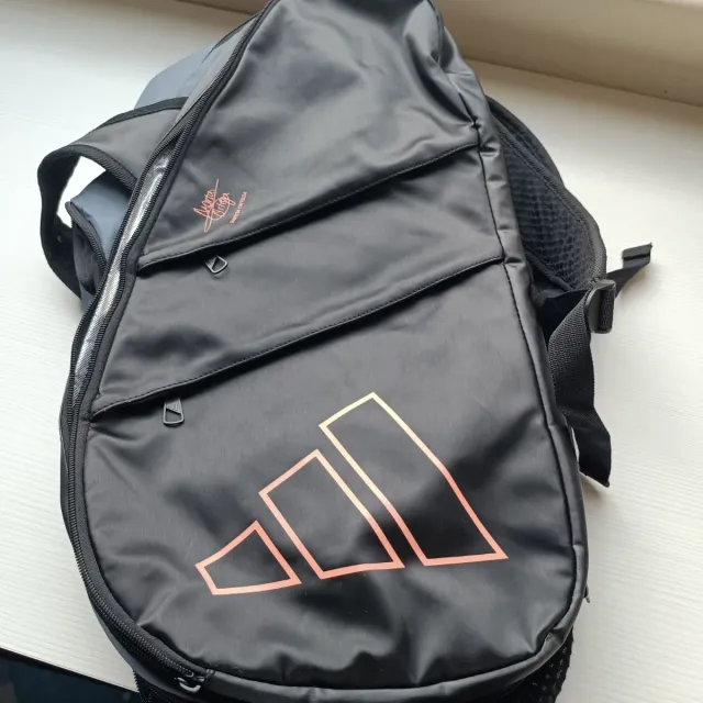Dettagli del prodottoBorsa per racchette da padel progettata in collaborazione con Marta Ortega e il marchio Adidas. Presenta un design moderno e funzionale. - Colore nero. - Logo Adidas in color corallo. - Firma di Marta Ortega stampata. La descrizione è stata tradotta automaticamente.