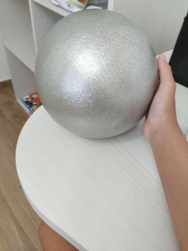 Palla da ginnastica ritmica, colore argento. È presente il nome ma con un pennarello dello stesso colore è facilmente cancellabile