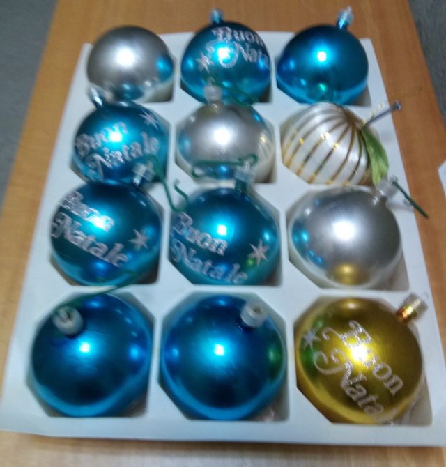 Dettagli del prodottoPalline per albero di Natale, confezione composta da 12 Palline assortite vari tipi, colore sul celeste, oro, grigio, alcune in vetro altre in stoffa, con dicitura BUON NATALE.