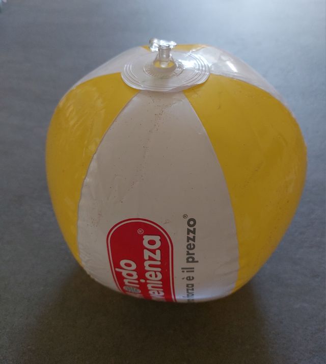 Dettagli del prodottoPallone gonfiabile 22 cm per la spiaggia del marchio Mondo Convenienza. È giallo e bianco ed è in buone condizioni.