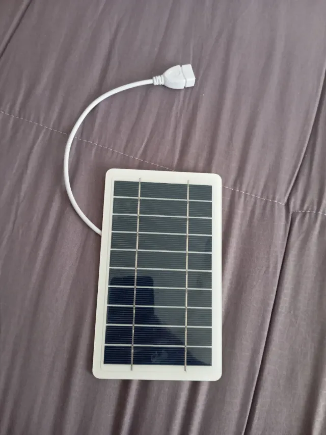 Piccolo pannello solare con cavo USB integrato. Ideale per caricare piccoli dispositivi. - Superficie con celle solari. - Cavo bianco con connettore USB femmina.