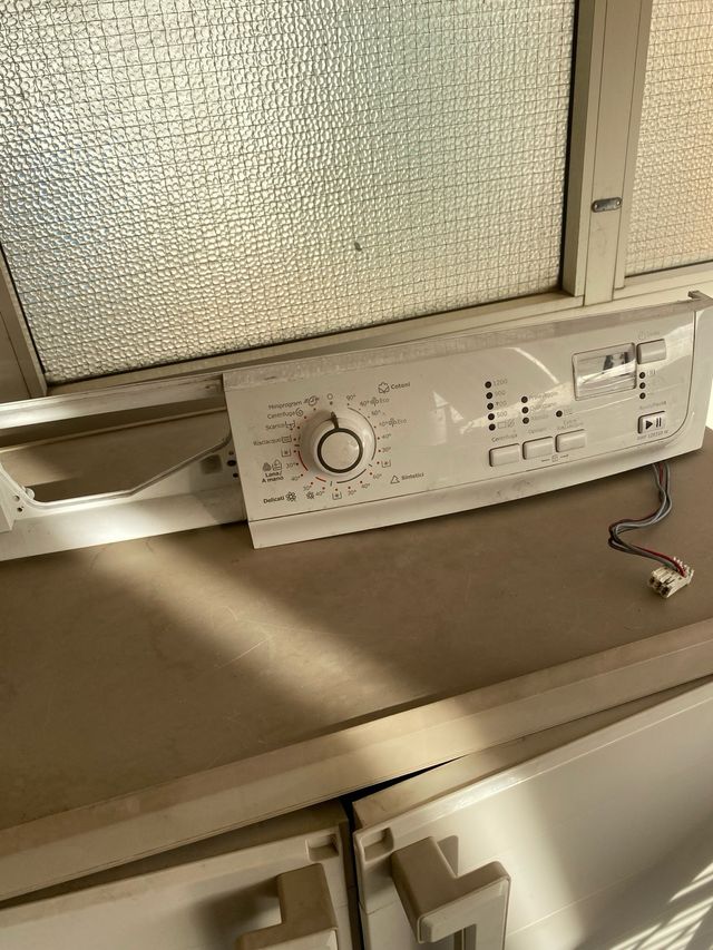Dettagli del prodottoPannello comandi per lavatrice Electrolux, completo di manopola e pulsanti.