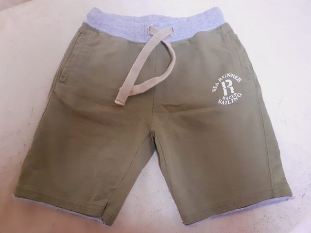 Pantaloncini da bambino di colore verde, adatti per 6/7 anni. - Vita elasticizzata con laccetto. - Tasche laterali. - Stampa Sea Runner Racing Sailing sul lato.