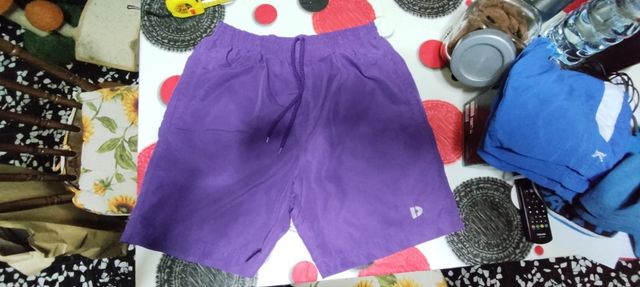 Bermuda/costume donnay viola, taglia M con lacci , tasche e tasca posteriore con cerniera. Utilizzabile anche come pantaloncini per sport