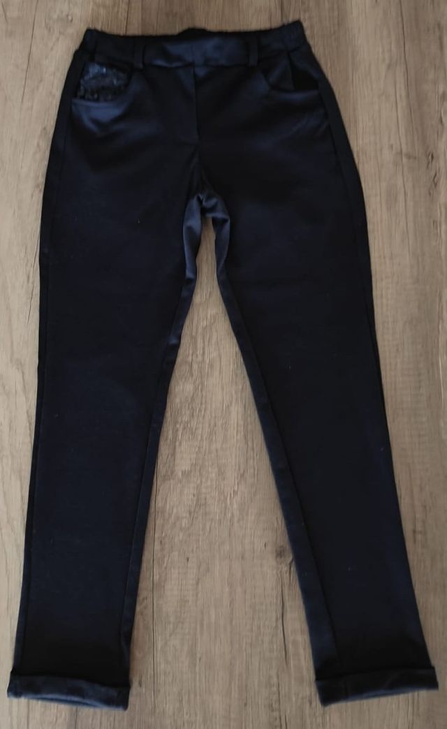 Dettagli del prodottoVendo un bellissimo paio di pantaloni da bambina marca Idexe, colore blu intenso, decorati con paiettes scintillanti sulla tasca destra.