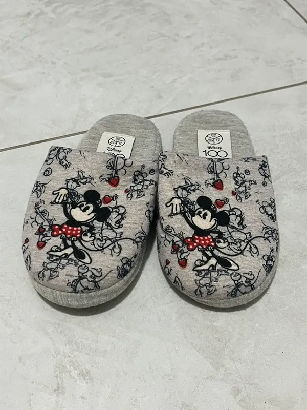 Pantofole da casa per bambina con stampa di Topolino Disney. - Taglia 30. - Design con Topolino e cuori rossi. - Etichetta Disney 100.