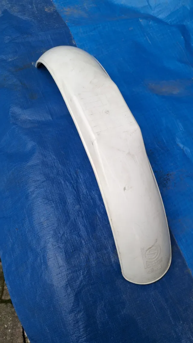 Parafango anteriore per moto da cross d'epoca. Marca Plastic screening Divs - Colore bianco. - Materiale plastico. - Logo inciso sul parafango. Nuovo epoca vintage