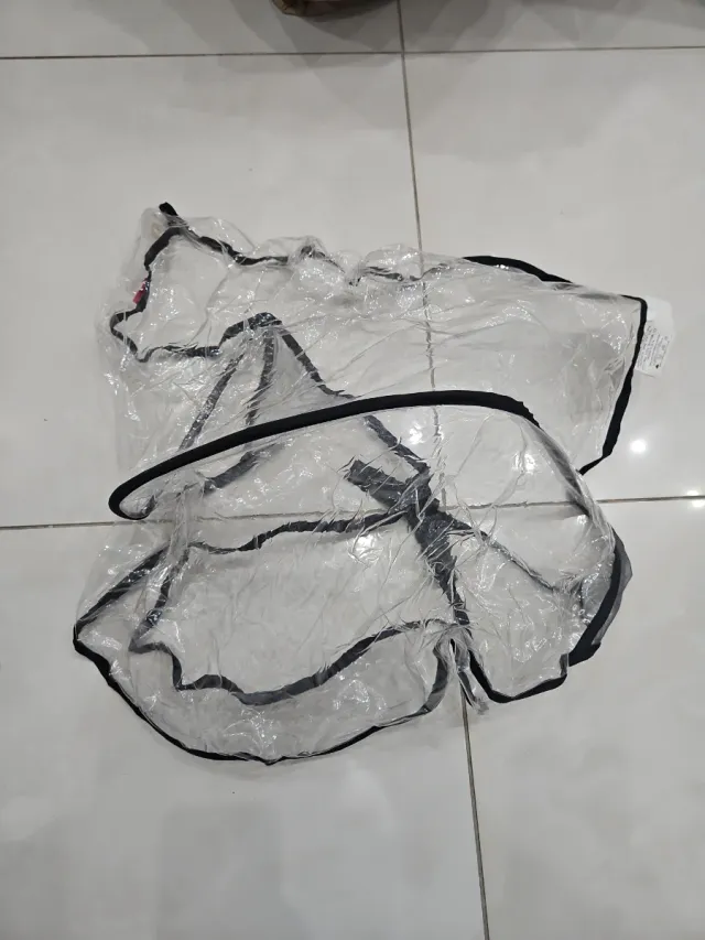 Parapioggia trasparente per passeggino Mc Laren. - Materiale in PVC trasparente. - Bordatura nera. - Chiusura con velcro.