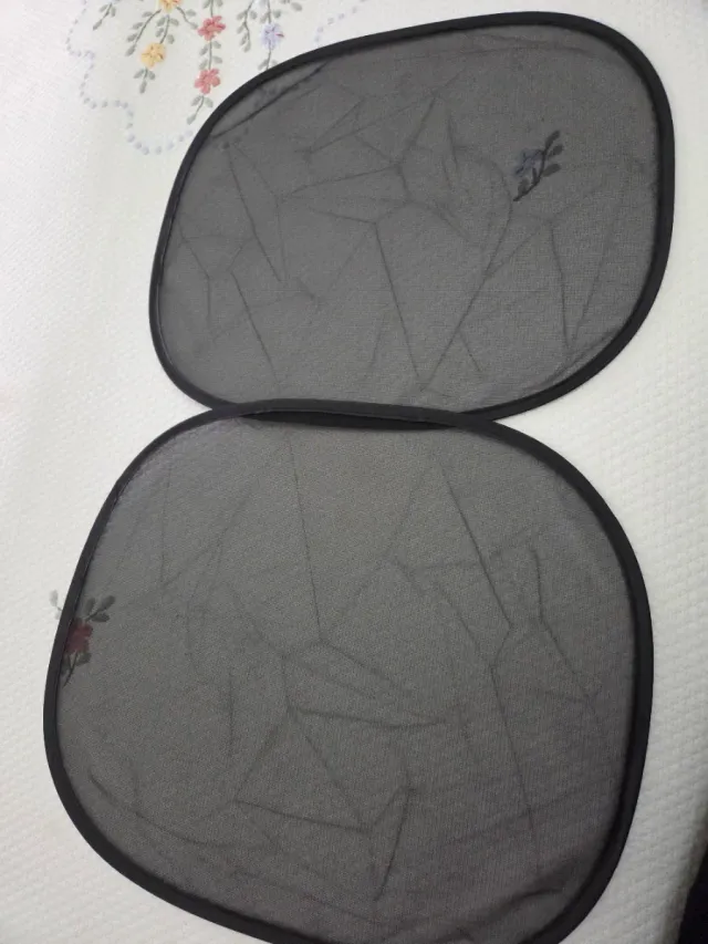Set di due parasole neri per auto, ideali per proteggere i più piccoli dal sole. - Tessuto a rete traspirante. - Bordi neri. - Forma ovale.