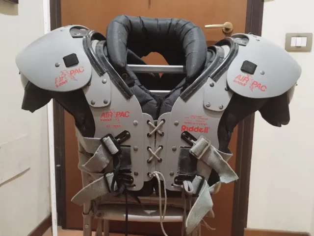 Dettagli del prodottoParaspalle professionale per football americano marca Riddell Air Pac con paracollo ad aria (collar neck) Riddell Air Pac, doppia cinghia (2 x lato), paracollo removibile e regolabile.