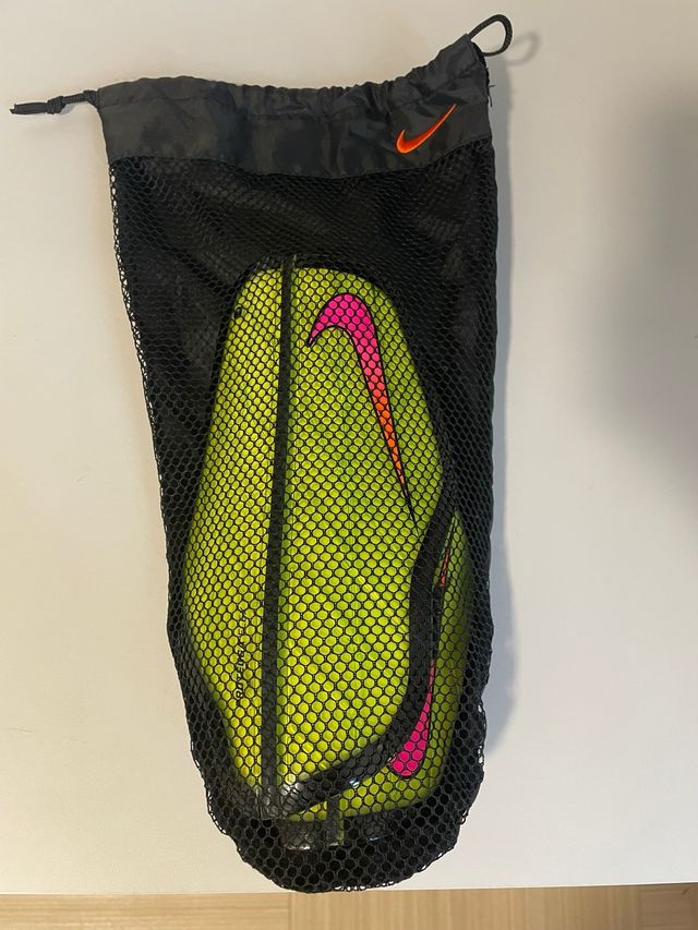 Parastinchi Nike in rete nera. - Colore giallo fluo con logo Nike fucsia e arancione. - Chiusura con laccio.