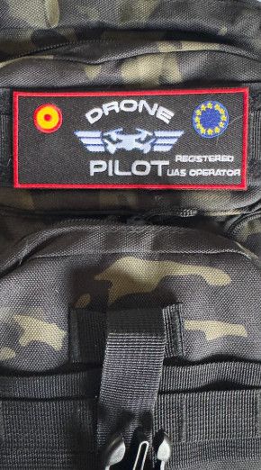 Distintivo ricamato per pilota di droni. Ideale per uniformi, berretti o zaini. Include un design con la bandiera della Spagna e la bandiera dell'Unione Europea. - Design di alta qualità. - Ricamo dettagliato. - Perfetto per l'identificazione nelle operazioni con droni. Include velcro sul retro per una facile applicazione.