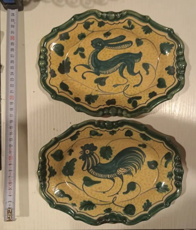 Dettagli del prodottoCoppia di piatti decorativi da appendere, con design del Puente del Arzobispo. Presentano un fondo giallo macchiato e un bordo verde festonato. - Piatto con design di coniglio saltellante. - Piatto con design di gallo. Coppia di piatti da appendere Puente del Arzobispo. La descrizione è stata tradotta automaticamente.
