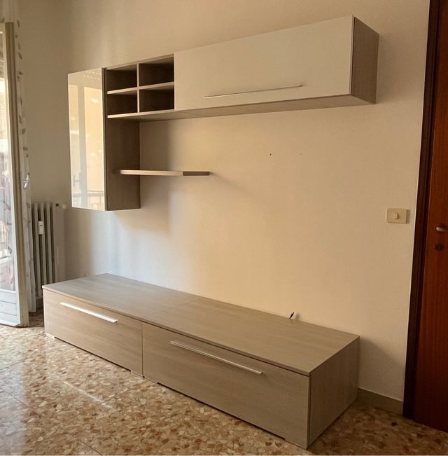Dettagli del prodottoSoggiorno composto da pensili con ante lucide, mensole porta libri e mobile base per la tv con 2 cassetti contenitori molto capienti.