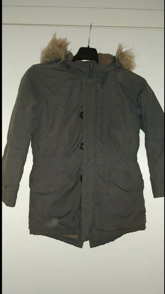 Parka bambino taglia M cm130 7/8 anni, grigio. Stato buono. Pelo finto amovibile.