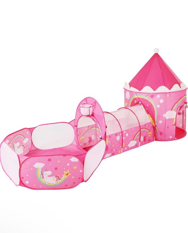 Dettagli del prodottoParco giochi divertente con tema unicorni e arcobaleni. Include tunnel e piscina di palline. Design in rosa. Stampe di unicorni e stelle. In regalo una borsa con palline. La descrizione è stata tradotta automaticamente.