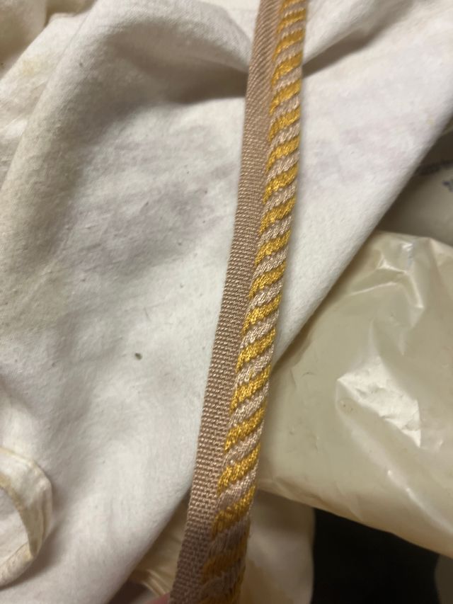 Dettagli del prodottoBellissima passamaneria con un design a cordoncino bicolore, beige e dorato. Perfetta per aggiungere un tocco di eleganza ai tuoi progetti di cucito o decorazione.