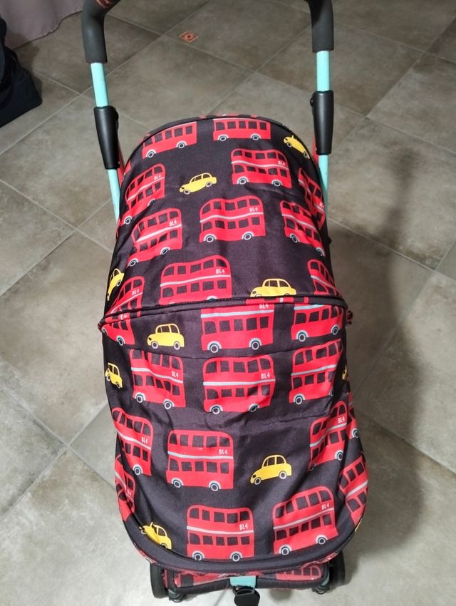 Dettagli del prodottoPasseggino leggero Cosatto con una divertente fantasia di autobus rossi e macchinine gialle.