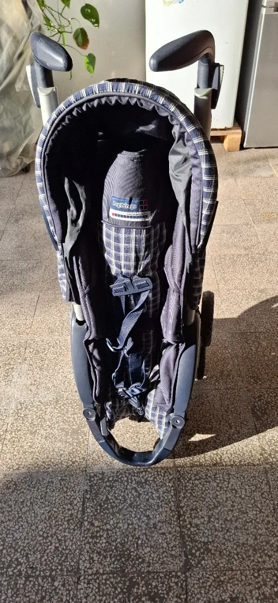 Vendo passeggino Peg Perego, ideale per i più piccoli. Presenta un design a quadri blu e bianco. - Tessuto a quadri. - Cinture di sicurezza. - Manici imbottiti.