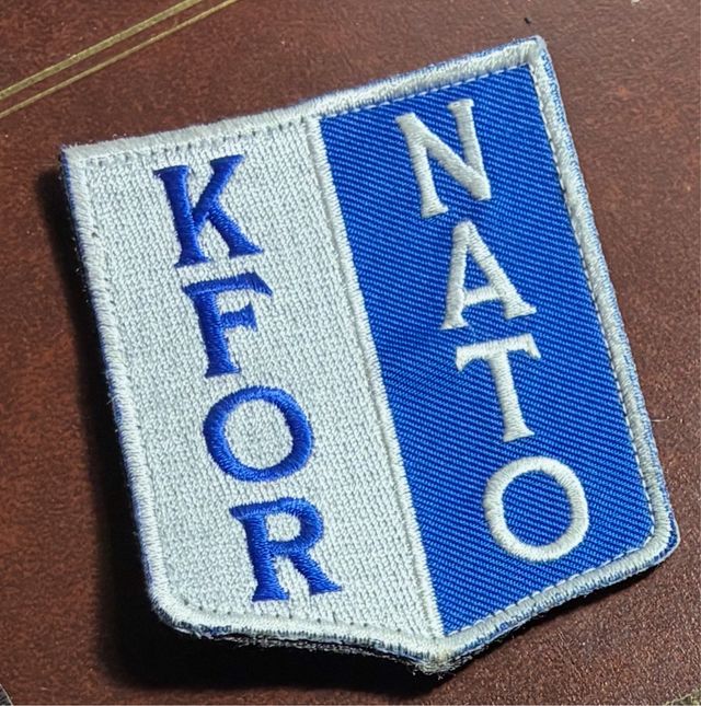 Patch KFOR NATO, ideale per collezionisti di militaria. - Patch con scritta KFOR su sfondo bianco. - Patch con scritta NATO su sfondo blu. - Bordo ricamato.