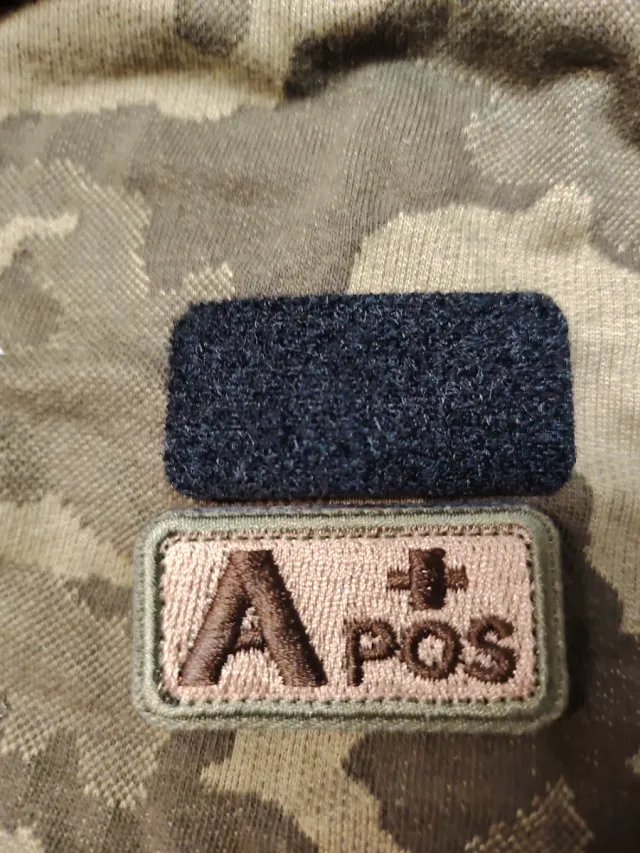 Patch militare con indicazione del gruppo sanguigno A positivo. - Patch in tessuto. - Velcro sul retro per fissaggio. Misure cm 5x2,5