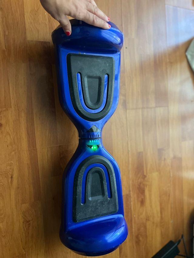 Dettagli del prodottoSkateboard elettrico tipo overboard in blu brillante. Ha luci LED verdi nella parte centrale.