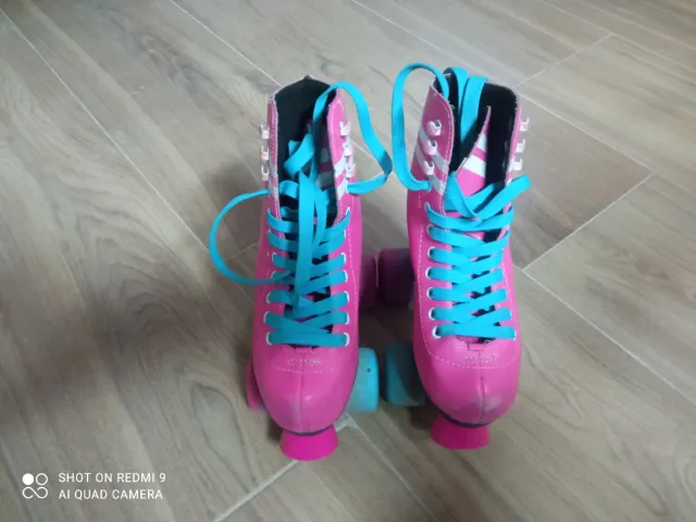 Dettagli del prodottoPattini a quattro ruote in colore rosa con dettagli in blu e bianco. Perfetto per iniziare a pattinare. Taglia 31-32. Design alto tipo scarpa. Lacciuoli di colore blu brillante. Ruote di colore blu e rosa. La descrizione è stata tradotta automaticamente.