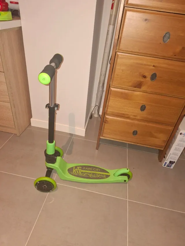 Dettagli del prodottoMonopattino a tre ruote in colore verde, quasi nuovo. Include una piattaforma antiscivolo con design, ruote anteriori doppie per maggiore stabilità, manubrio regolabile in altezza. Ruota e si piega. La descrizione è stata tradotta automaticamente.