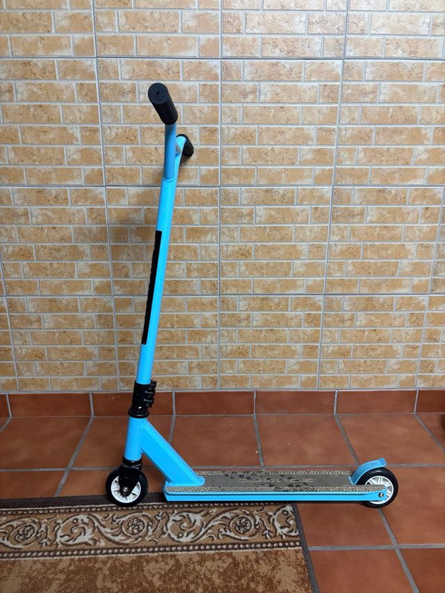 Monopattino di colore blu, perfetto per spostarsi. - Ruote bianche. - Piattaforma con design. - Manubrio nero.
