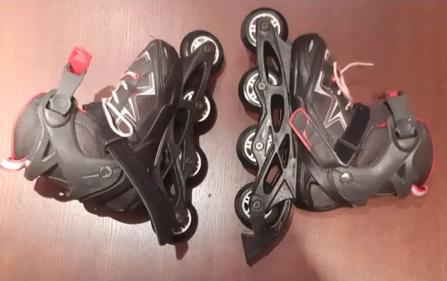 - 4 ruote per pattino con freno posteriore nel pattino destro. Dotato di lacci per la parte bassa, fascia a strappo e gancio per chiudere la parte sopra.