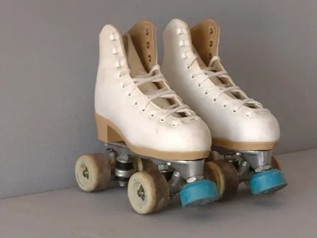 Pattini a rotelle classici in colore bianco. - Toma alta per supporto alla caviglia. - Lacci bianchi. - Ruote marroni e fermi blu.