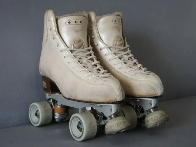 Dettagli del prodottoCoppia di pattini a rotelle bianchi, modello Riedell.