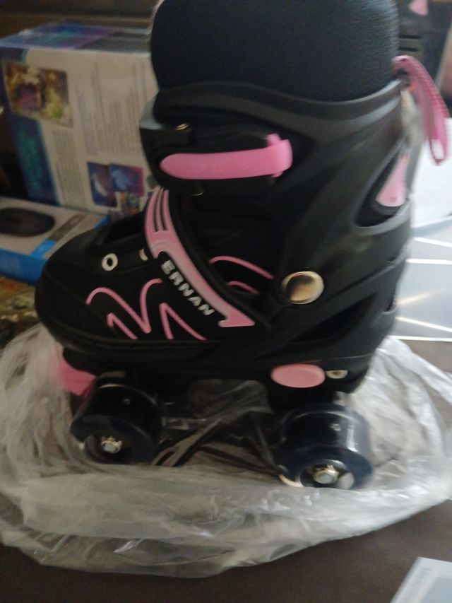 Dettagli del prodottoVendo un paio di pattini a rotelle nuovi, perfetti per iniziare a pattinare. Sono neri con dettagli rosa, e sembrano in ottime condizioni.