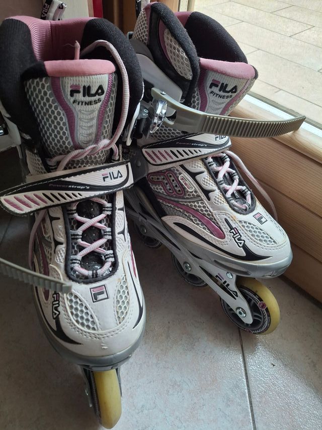 Pattini in linea marca Fila, modello Fitness, in ottime condizioni. - Colore bianco, rosa e grigio. - Chiusura con lacci e strap. - Ruote per pattinaggio.
