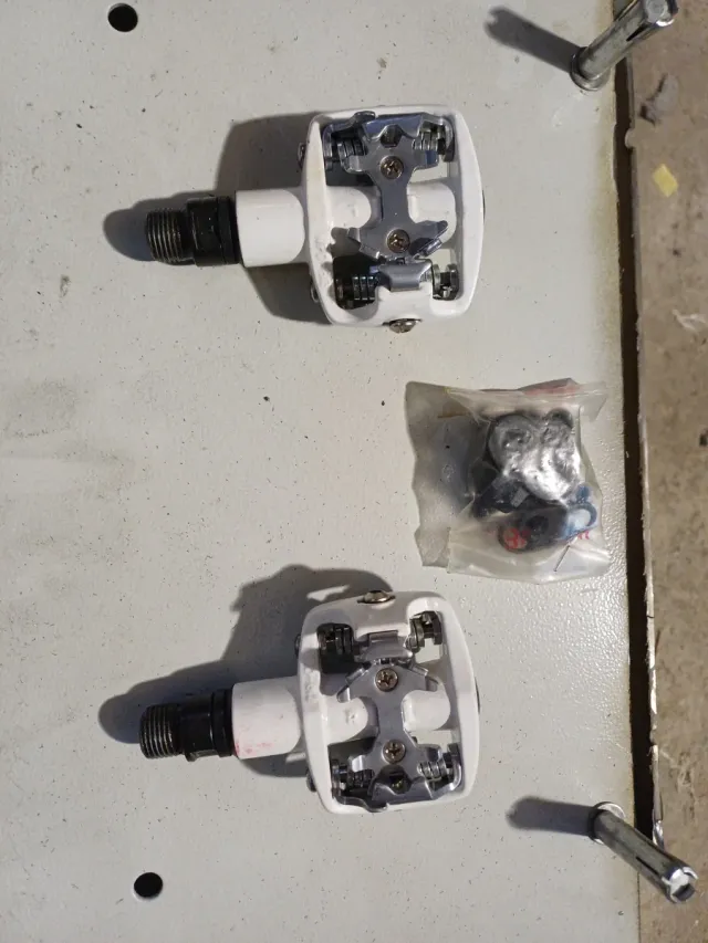 Dettagli del prodottoIn vendita pedali per bicicletta da montagna in bianco. Include tacchette. - Pedali per MTB. - Colore bianco. - Include tacchette. La descrizione è stata tradotta automaticamente.