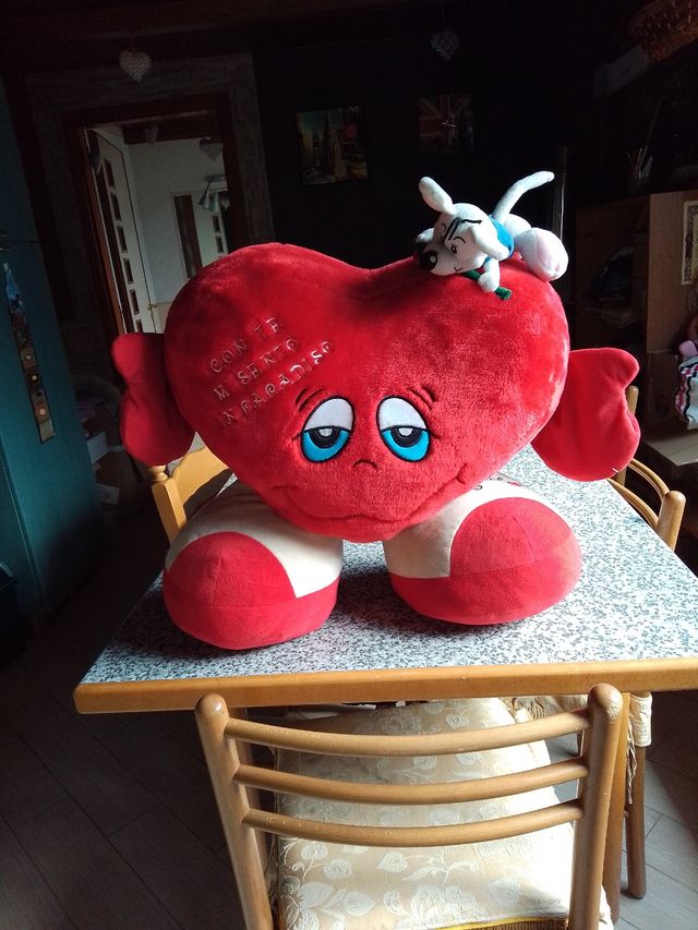 Dettagli del prodottoBellissimo peluche a forma di cuore rosso, piuttosto grande e morbido. Un cagnolino bianco è appoggiato sopra. Perfetto per un regalo romantico o per chi ama i peluche teneri. - Misure generose. - Colore rosso intenso. - Materiale soffice e piacevole al tatto.