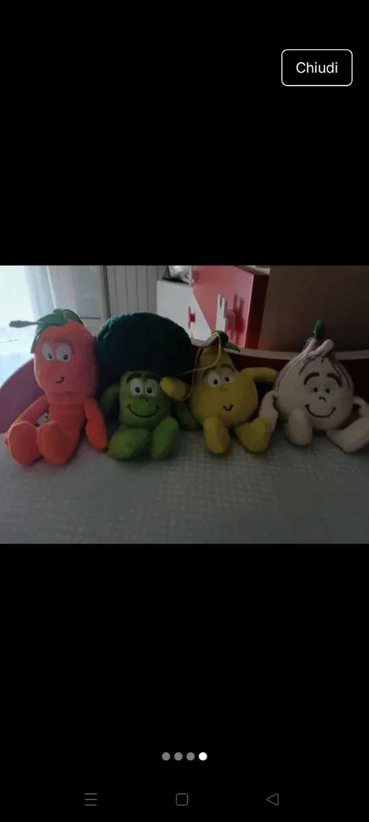 Dettagli del prodottoSet di 4 simpatici peluche a forma di frutta e verdura.