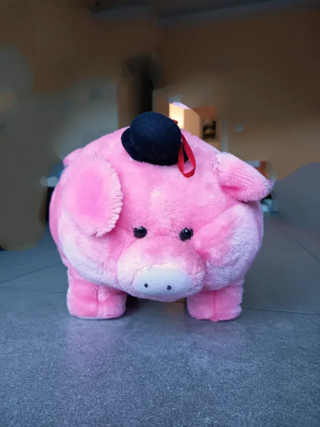 Dettagli del prodottoSimpatico peluche a forma di maialino rosa, con un piccolo cappello nero in testa.