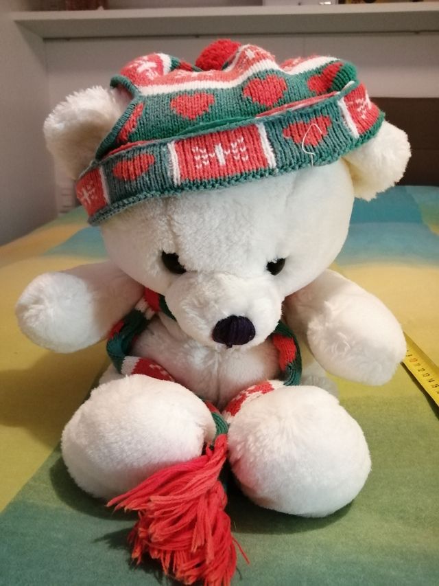 Peluche orso bianco sciarpa e cappello. Lunghezza 40 cm circa