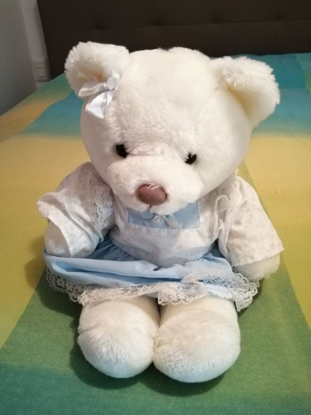Peluche orso bianco vestito. Lunghezza 40 cm circa