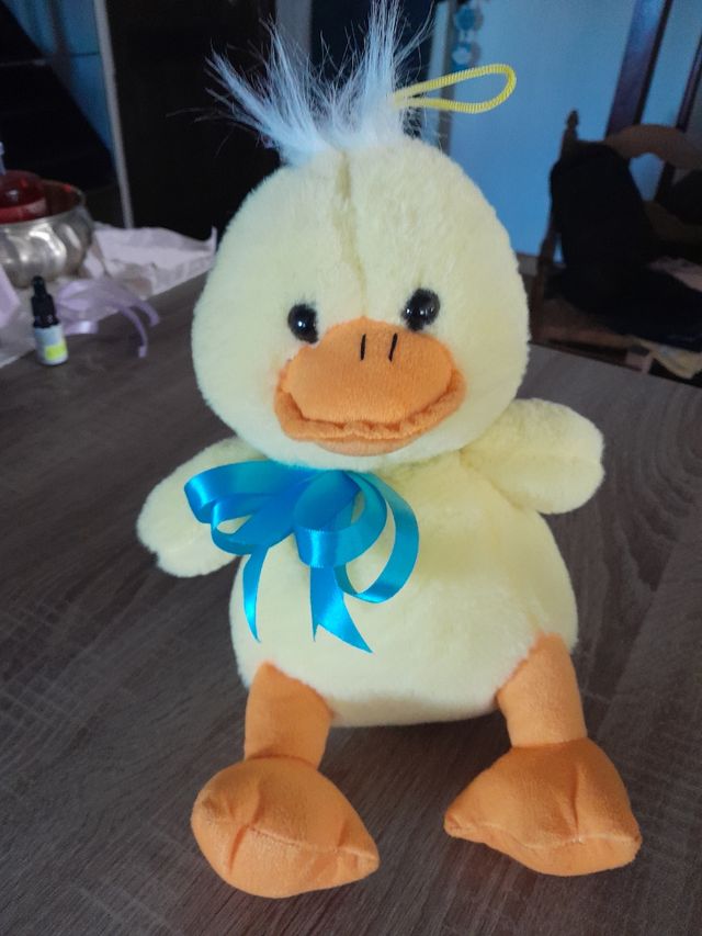 Peluche medio papero con fiocco azzurro, gancetto per appenderlo,altezza cm 33,lunghezza cm 23,larghezza cm 20. Perfetto pari al nuovo