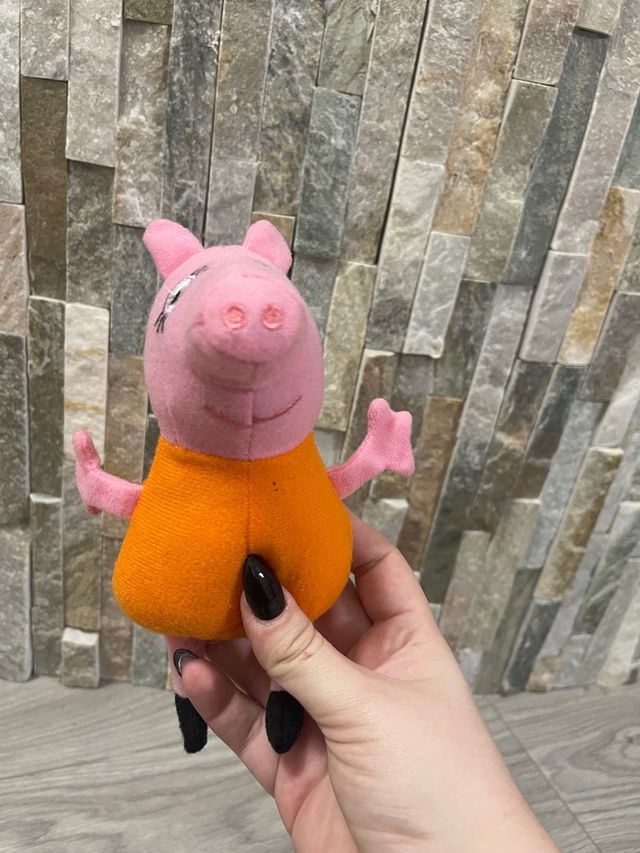 Morbido peluche di Peppa Pig, perfetto per i più piccoli. Realizzato in morbido tessuto rosa, indossa un vestito arancione. - Materiale: Tessuto morbido. - Colore: Rosa e arancione.